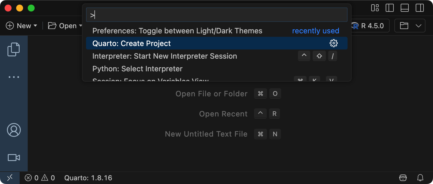 To create a new website project within VS Code, execute the Quarto: Create Project command from the command-palette:
